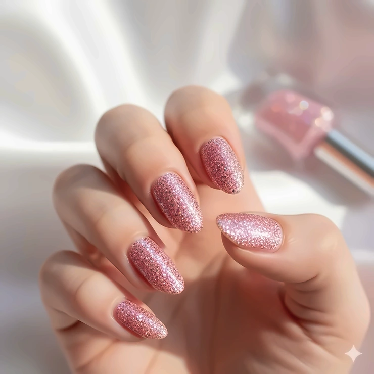 Layering strategy: Apply a solid pink base first, then add glitter polish on top. This creates depth and ensures even coverage with fewer glitter coats.